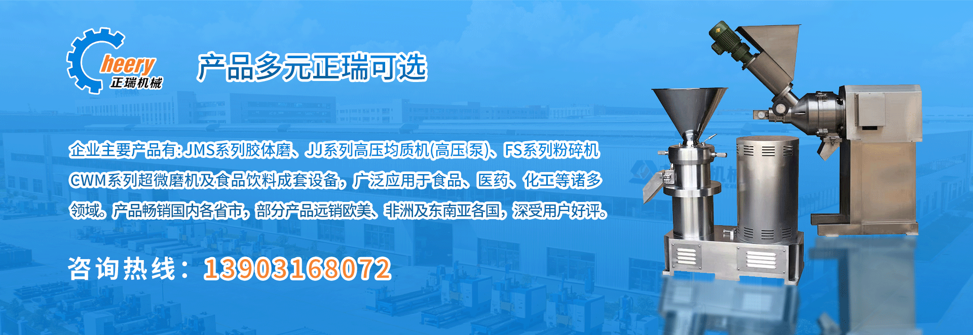 公司主要產(chǎn)品有JMS系列膠體磨、JJ系列高壓均質(zhì)機(jī)、FS系列粉碎機(jī)、CWM系列超微磨機(jī)、PG破骨機(jī)系列以及食品飲料成套設(shè)備等。產(chǎn)品廣泛應(yīng)用于食品、醫(yī)藥、化工等領(lǐng)域,暢銷(xiāo)國(guó)內(nèi)并出口歐美、非洲、東南亞等國(guó)家,深受用戶(hù)好評(píng)。